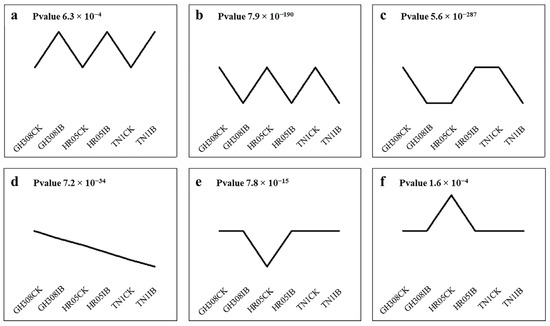 Six expression patterns (a–f) of DEGs were found in different rice samples. GH308, HR05, and TN1 are the three rice varieties. CK indicates control samples. IB represents rice samples that were infected by BHPs. Each module was statistically significant, with p values < 0.05.