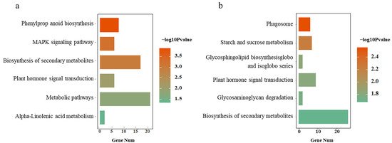 Functional annotation of consistent DEGs in the three rice varieties. KEGG pathway analysis of 235 up-regulated genes (a) and 689 down-regulated genes (b). The x-axis represents the number of genes in each pathway, and the y-axis shows the top six enriched KEGG pathways. Colors in the bar plots indicate statistical significance in log format.
