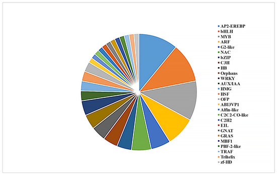 Transcription factors (TFs) play important roles in the growth and development of plants [32]. We further analyzed the function of TFs in response to the BPH. A total of 73 TFs were identified from the genes that were present in Modules a and b (Figure 6). These genes belong to a series of functionally important TF families, including AP2-EREBP (eight genes), bHLH (eight), MYB (eight), ARF (six), G2-like (four), and NAC (four) (Figure 6). In addition, these TF genes were sorted from high to low according to their average expression level in the tested samples. Notably, the top four genes were consistently up-regulated after BPH treatment. The gene with the highest expression level was a B-box zinc finger family protein with an unknown function. The second gene was OsCOL4, which is a constitutive flowering repressor, and the following two genes were two ethylene-responsive element binding proteins, suggesting that ethylene played an important role in response to the BPH (Table S5).