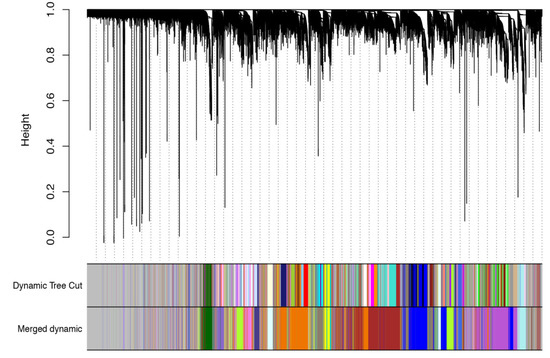 The WGCNA R package was used to perform weighted analysis on all genes. The procedure is as follows: import the FPKM list and corresponding phenotype data list; check and filter the FPKM list; and remove rows that contain invalid values or whose mean FPKM is less than 0.5; screen the β values (1–30) and construct a proximity matrix and a topological matrix; use the dissimilarity between genes to cluster genes; and then use the dynamic cutting method to cut the tree into different modules (the minimum number of genes in each module is 30) and merge the modules.