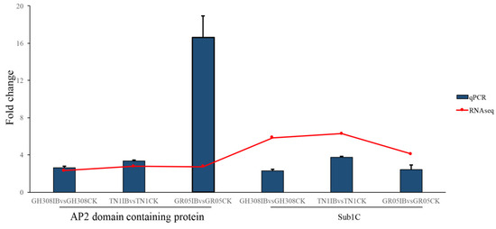 We validated the accuracy of our RNA-seq analysis based on qRT-PCR. An AP2 domain containing protein gene and a Sub1C gene were randomly selected for testing. Our analysis showed that these genes in RNA-seq agreed with the results of the qRT-PCR. The qRT-PCR results and RNA-seq analysis were highly consistent, which supports the accuracy of our analysis (Figure 9).