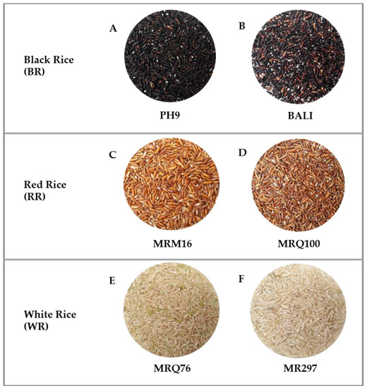 Selected de-husked grains of pigmented and non-pigmented rice varieties that were used in this study. Black rice (BR) varieties are represented by PH9 (A) and BALI (B); red rice varieties (RR) consist of MRM16 (C) and MRQ100 (D); and white rice (WR) varieties are comprised of MRQ76 (E) and MR297 (F).