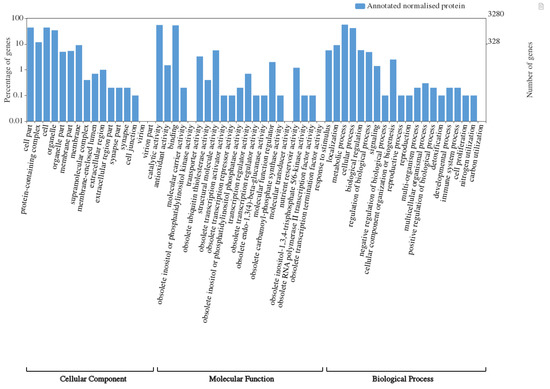 The present study employed SWATH-MS-based quantitative proteomics to compare the proteomes across rice varieties comprised of black rice (BR: PH9 and BALI), red rice (RR: MRM16 and MRQ100), and white rice (WR: MRQ76 and MR297) (Figure 1) with triplicate samples for each variety. The MS raw data, including the results of protein and peptide identification, were deposited to the ProteomeXchange Consortium with the identifier PXD018338 [10]. A total of 5673 proteins were identified across 18 samples on the basis of the data-dependent acquisition. Among these, 4022 significantly expressed proteins were identified (FDR < 1%, confidence level of ≥99%). Amongst a total of 3280 annotated proteins that were retrieved from the rice databases, there were 1606, 2766, and 2277 functional terms that were assigned to all 4022 identified proteins that were assigned to cellular component (CC), molecular function (MF), and biological process (BP), respectively (Figure 2). As for cellular component ontology, annotated proteins were majorly assigned to cell (1441 proteins), cell part (1441 proteins), and organelle (1128 proteins), where these proteins were actively involved in metabolic (1865 proteins) and cellular processes (1371 proteins). Meanwhile, the molecular functions of these proteins were largely associated with catalytic activity (1807 proteins) and binding (1751 proteins). Of note is that a small portion of annotated proteins (50 proteins) exhibited antioxidant activity, suggesting that they are the key contributors of rice grain antioxidant properties.