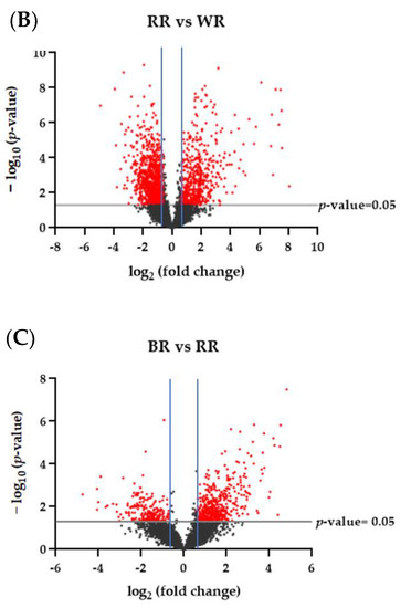 Volcano plots between black and white rice (BR vs. WR) (A), red and white rice (RR vs. WR) (B), and black and red rice (BR vs. RR) (C). The protein abundance data were plotted on a log2 scale (x-axis) versus a –log10 transformation of the p-value (y-axis). A significant cut off (p < 0.05) was set (grey line on the y-axis) and the significant up- and down-regulated proteins were determined using ± 1.5-fold change, respectively. BR vs. WR: 195 and 481 significant up- dan down-regulated proteins, respectively (A); RR vs. WR: 192 and 448 significant up- and down-regulated proteins, respectively (B); and BR vs. RR: 163 and 101 significant up- and down-regulated proteins, respectively (C).