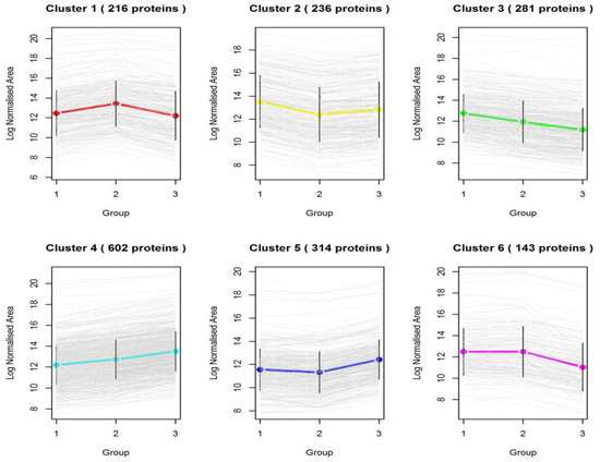 K-means clustering of differentially expressed proteins across three designated rice groups (BR, RR, and WR). Values represent the log transformed normalized abundance value of proteins that significantly differed between group(s) with a fold change ±1.5 and significance threshold, p < 0.05 according to ANOVA analysis. Group 1, 2, and 3 represent BR, RR, and WR, respectively. Colored data points mark the centroids of each cluster.