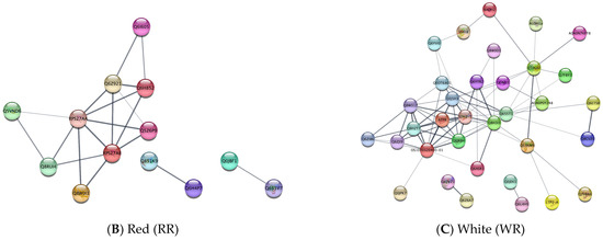 Protein–protein interactions (PPIs) network between differential expression proteins (DEPs) in black (PH9 and BALI), red (MRM16 and MRQ100), and white (MRQ76 and MR297) rice. Colors indicate nodes of different types of protein. A total of 30, 13, and 35 DEPs were interacted in black, red, and white rice varieties, respectively (A–C).