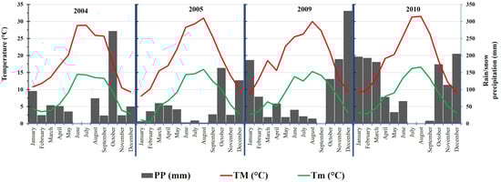 Climatic conditions of Vila Real, Portugal during 2004–2005 and 2009–2012 seasons. Note: PP for monthly rain or snow precipitation in mm; TM for monthly average maximum temperature in °C and Tm for monthly average minimum temperature in °C.