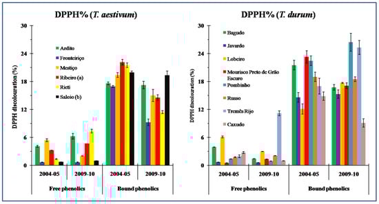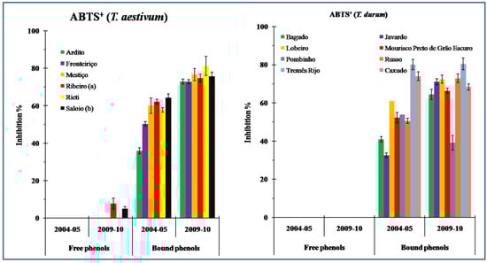 Like total DPPH antioxidant capacity, Tremês Rijo (durum) also showed the highest ABTS levels (Figure 2). Among bread wheat genotypes, Saloio (b) exhibited the overall highest ABTS level, which showed >20% inhibition value for DPPH. When comparing both methods to determine the antioxidant activity, ABTS represented a higher variation than DPPH (Figure 2; Table S3). Moreover, both methods demonstrated higher antioxidant activity of bound phenolics. DPPH and ABTS methods revealed significant differences between seasons (2004–2005 and 2009–2010) for total antioxidant activities in bread and durum wheat.