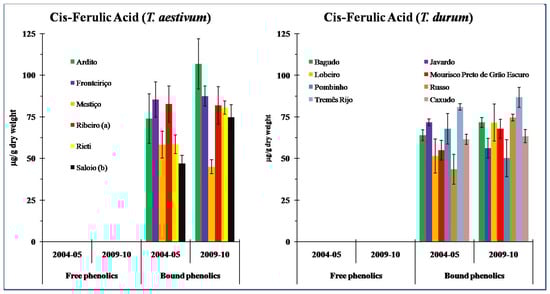In general, ferulic acid is the most abundant phenolic acid in wheat grains, representing up to 95% on average of total phenolic acids, and occurs in free and bound forms [45]. In the present study, we measured both cis- and trans-isomers of ferulic acid in free and bound extracts. The predominant contribution (97%) of bound ferulic acid in total ferulic acid detected in the present study was similar to previously obtained results in wheat [46,47].