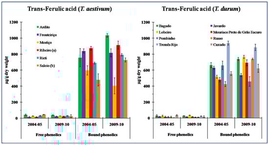 Yet, most previous phenolics studies in wheat have been limited to grain fractions and performed only in a few genotypes. Only a few studies involving many genotypes have been conducted [21,22]. Thus, the objectives of the present study were to assess variability for total phenolic contents (free and bound) in grains of Portuguese bread and durum wheat germplasm and to determine further the antioxidant activity and ferulic acid profiles, including both cis- and trans-isomers of selected genotypes of both bread and durum wheat.