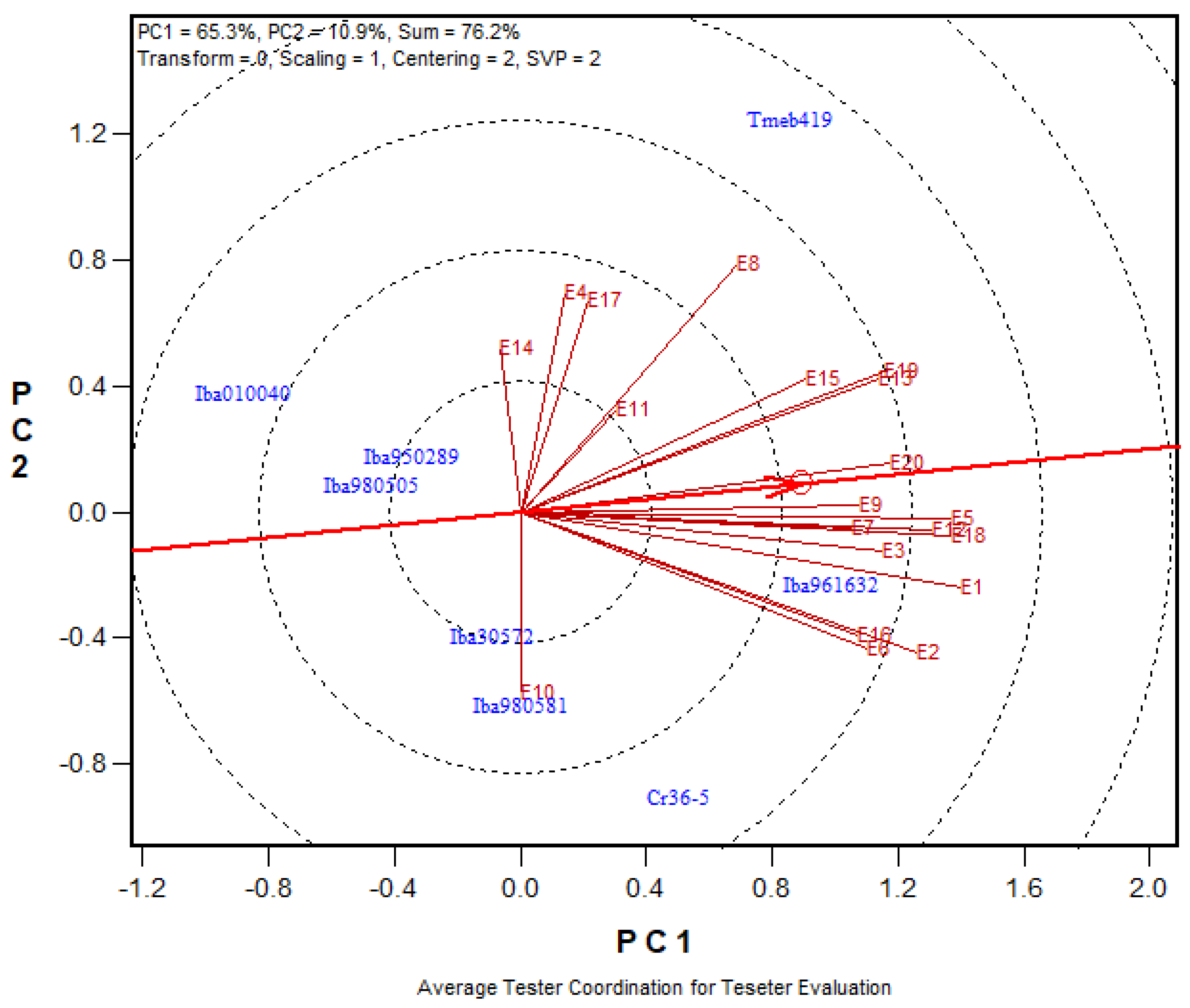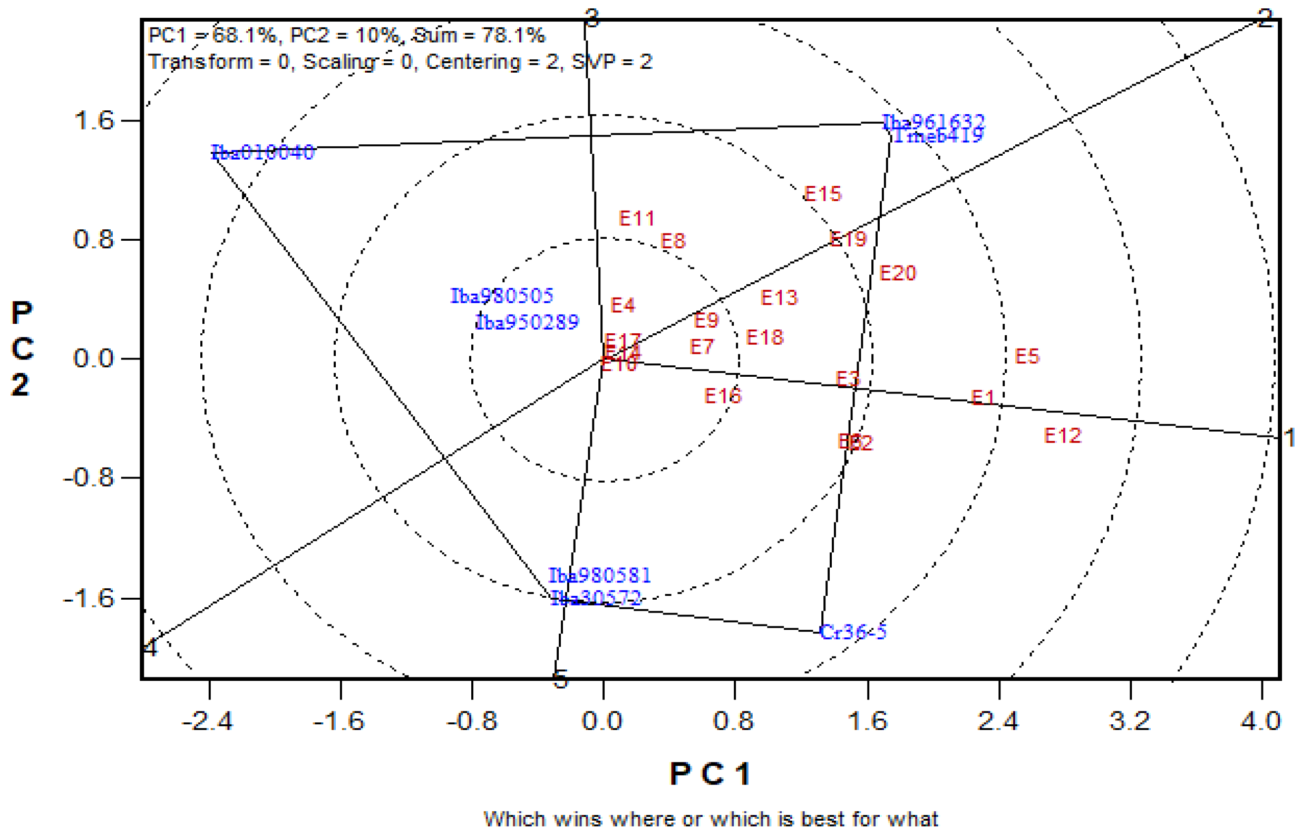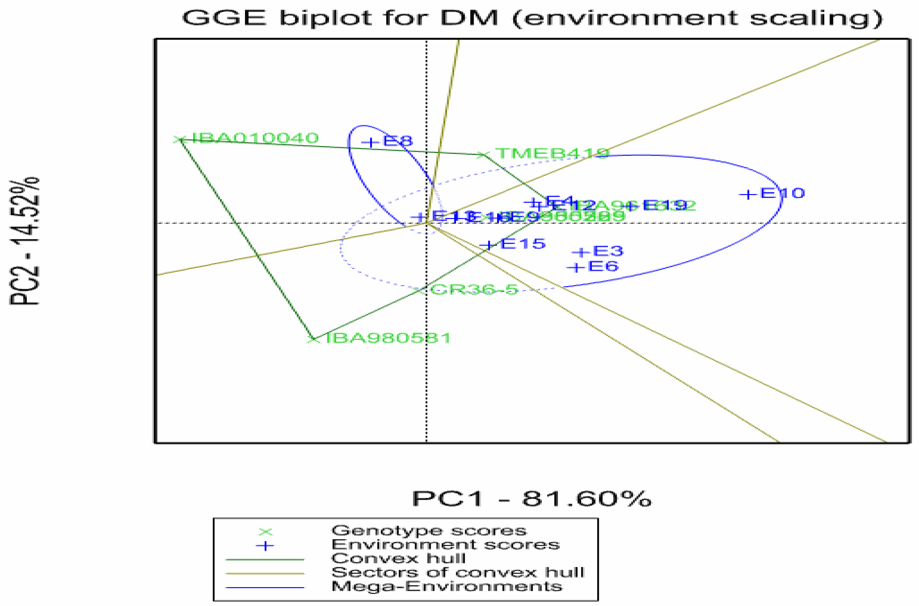 viz. (E4, E11, E15, E8, and E17) fell into the sector where genotypes IBA961632 and TMEB419 were the vertex clones. This means that IBA961632 and TMEB419 were the best clones in this environment. The two other environments, namely, E12 and E2, fell into the sector in which genotype CR36/5 was the vertex clone. This clone outyielded all other clones by producing the maximum dry yield in these two environments. No environment fell into sectors where the genotypes