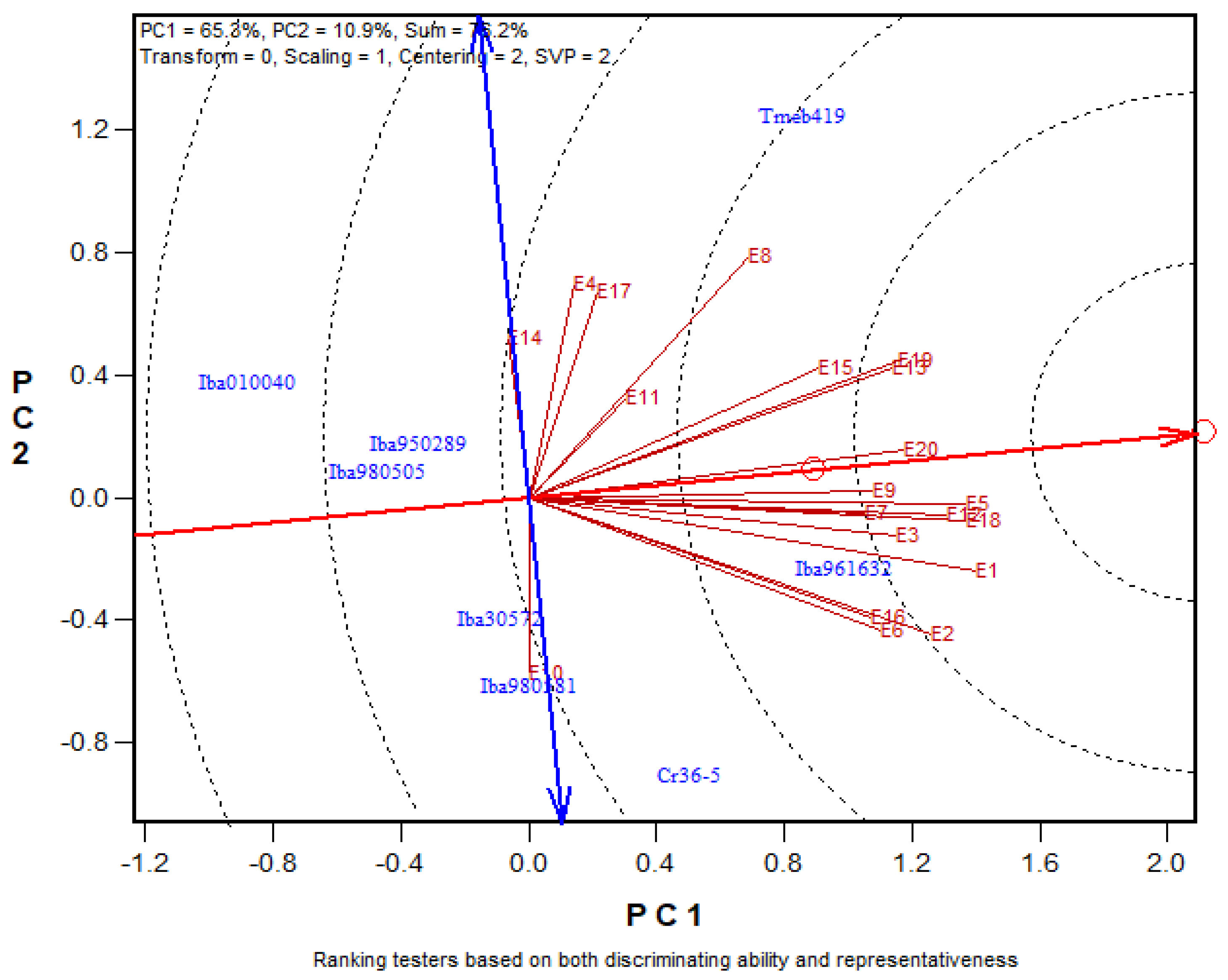 viz., IBA980505, and IBA950289 were located near the origin and were found to be less responsive to the environment compared to those located on the vertices far away from the origin.