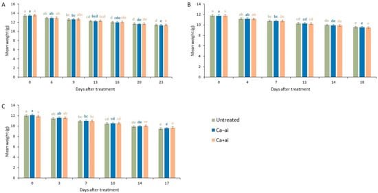 Mean weight (g) for three repeats (A–C) of experiment for cherry tomatoes brought from a UK supermarket for untreated, misted with 5% Ca–ai (active ingredient—MCAS) or misted with 5% Ca+ai treated once on first scoring date. There were no significant differences between treatments for each repeat, and lowercase letters indicate significant differences between combined weights for scoring dates (ANOVA (non-parametric) followed by Dwass–Steel–Critchlow–Fligner pairwise comparisons, p < 0.05). n = 40, bars indicate standard errors of means.