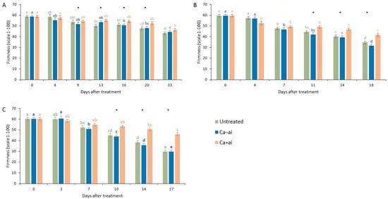 Mean firmness (unitless scale of 0 soft to 100 hard) for three repeats (A–C) of experiment for cherry tomatoes brought from a UK supermarket for untreated, misted with 5% Ca–ai (active ingredient—MCAS) or misted with 5% Ca+ai treated once on first scoring date. Lowercase letters above bars for each treatment indicate significant differences between scoring dates for that treatment (ANOVA followed by independent sample t-tests, p < 0.05). * indicates significant differences between the Ca+ai and the other two treatments for that sampling date (ANOVA followed by independent sample t-tests, p < 0.05). n = 40, bars indicate standard errors of means.