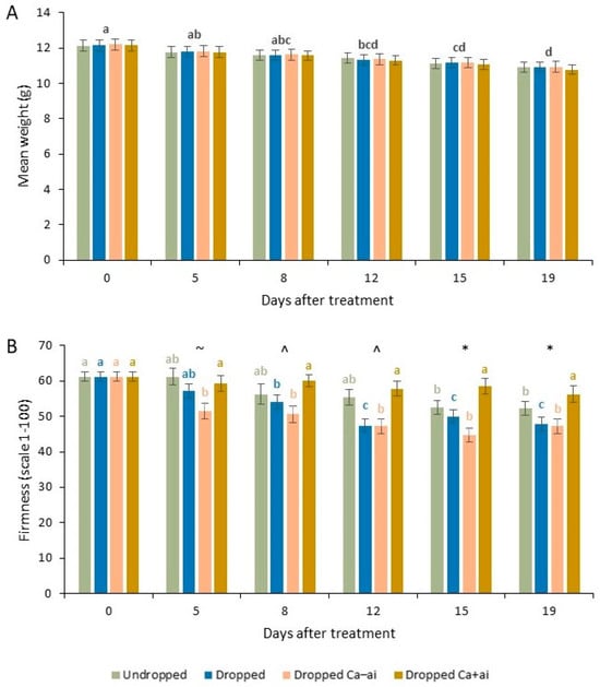 Mean weight (g) (A) and firmness (unitless scale of 0 soft to 100 hard) (B) for first repeat of experiment for cherry tomatoes brought from a UK supermarket for undropped and untreated (undropped), dropped and untreated (dropped), dropped and misted with 5% Ca–ai (active ingredient—MCAS) (dropped Ca–ai) or dropped and misted with 5% Ca+ai (dropped Ca+ai) treated once on first scoring date. (A) There were no significant differences between treatments for each sample date, and lowercase letters indicate significant differences between combined weights for scoring dates (ANOVA (non-parametric) followed by Dwass–Steel–Critchlow–Fligner pairwise comparisons, p < 0.05). (B) Lowercase letters above bars for each treatment indicate significant differences between scoring dates for that treatment (ANOVA followed by independent sample t-tests, p < 0.05). ~ indicates significant difference between dropped Ca+ai and dropped Ca-ai treatment, ^ indicates significant difference between dropped Ca+ai and dropped with dropped Ca-ai treatments and * indicates significant differences between the dropped Ca+ai and the other three treatments for that sampling date (ANOVA followed by independent sample t-tests, p < 0.05).