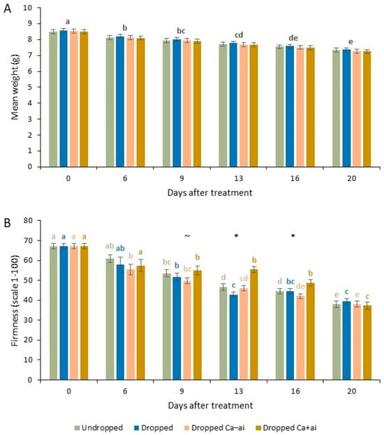 Mean weight (g) (A) and firmness (unitless scale of 0 soft to 100 hard) (B) for second repeat of experiment for cherry tomatoes brought from a UK supermarket for undropped and untreated (undropped), dropped and untreated (dropped), dropped and misted with 5% Ca–ai (active ingredient—MCAS) (dropped Ca–ai) or dropped and misted with 5% Ca+ai (dropped Ca+ai) treated once on first scoring date. (A) There were no significant differences between treatments for each sample date, and lowercase letters indicate significant differences between combined weights for scoring dates (ANOVA (non-parametric) followed by Dwass–Steel–Critchlow–Fligner pairwise comparisons, p < 0.05). (B) Lowercase letters above bars for each treatment indicate significant differences between scoring dates for that treatment (ANOVA followed by independent sample t-tests, p < 0.05). ~ indicates significant difference between dropped Ca+ai and dropped Ca–ai treatment and * indicates significant differences between the dropped Ca+ai and the other three treatments for that sampling date (ANOVA followed by independent sample t-tests, p < 0.05).