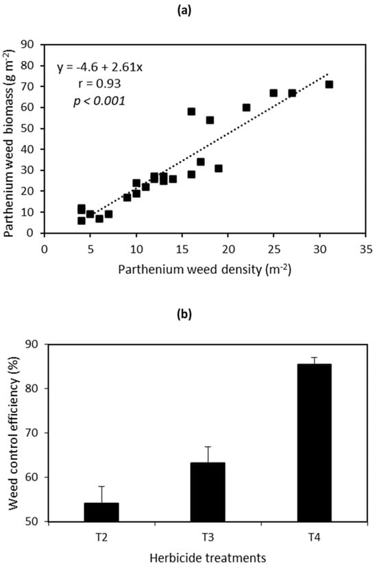 | Weed Control Treatment | Parthenium Weed Density (m−2) * | Parthenium Weed Dry Biomass (g m−2) |