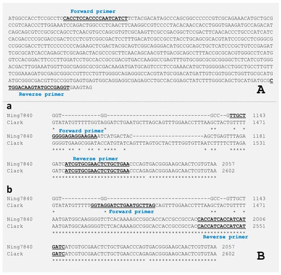 To design the gene-based marker for Fhb1, the previously cloned sequence of the susceptible allele TaHRC-S as 2650-bp sequence from NIL-S (GenBank accession MK450309) and the resistant allele TaHRC-R as 2041-bp sequence from NIL-R (GenBank accession MK450312) were retrieved from Su et al. []. Clustal Omega software [] was used for sequence alignment. For the amplification of the resistant allele, forward primer was anchored starting from 1138 bp of the ‘Ning7840’, which had 8 bp nucleotides mismatched in the ‘Clark’ allele (Figure 2B(a)). For the amplification of the susceptible allele, forward primer was anchored to 1424 bp of the susceptible allele (Clark), which had a 1 bp similarity and 18 bp deletion in the Ning7840 (Figure 2B(b)). Reverse primer for both resistance (Ning7840) and susceptible (Clark) sequences was designed by selecting a region that is common in both resistance (Ning7840) and susceptible (Clark) sequences (Figure 2B). Primers for both the Fhb1 and Fhb7 alleles were designed using the Primer3 tool []. The location of the primer sequences of the resistant allele of Fhb7 are depicted in Figure 2A. In addition, primer sequences for resistant as well as susceptible alleles for Fhb1 are depicted in Figure 2B(a)and Figure 2B(b), respectively.