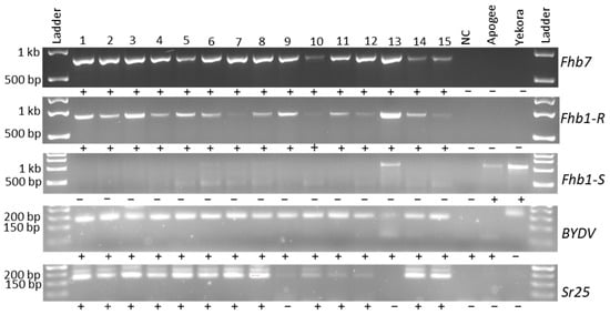 Gel electrophoresis images for the amplification of the five alleles (Fhb7, Fhb1_R, Fhb1_S as well as Bdv3 and Sr25) in our soft red winter wheat (SRWH) lines already harboring Fhb1-R allele. 15 tested lines are represented from number 1 to 15. The presence of the genes followed by gel electrophoresis is indicated by the (+) sign, while absence is indicated by the (−) sign. Water template was used as negative control (NC), while the wheat lines Apogee and Yekora were negative control for the Fhb7 as well as Fhb1-R, but the positive control for the Fhb1-S which is known to have a susceptible allele of the TaHRC.