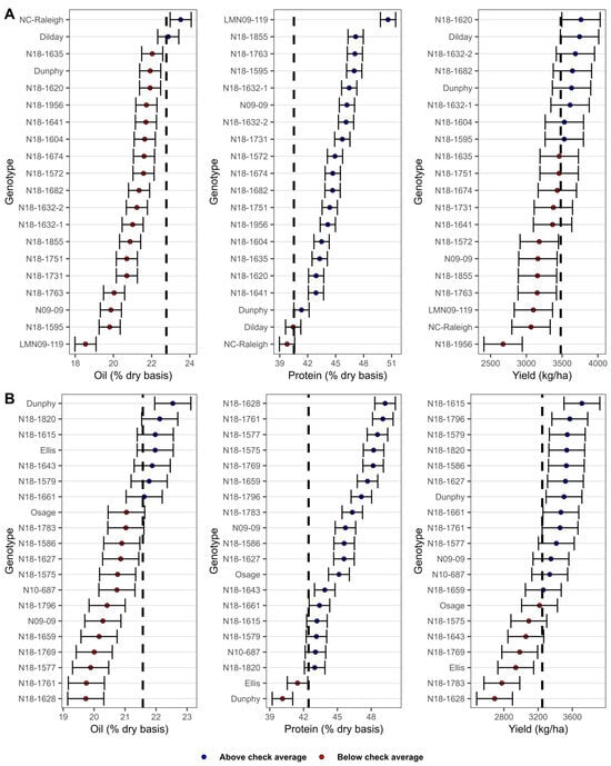 Genotype least square means for seed oil, seed protein, and seed yield for soybean RIL in Test 1 (A) and Test 2 (B). Points indicate that least square means and error bars indicate the standard errors in the estimation of least square means. Blue dots indicate that an RIL has a least square mean above the average of the checks in the test and a color of red indicates that the RIL has a mean value below the check average. The check average is shown with the vertical dashed line.