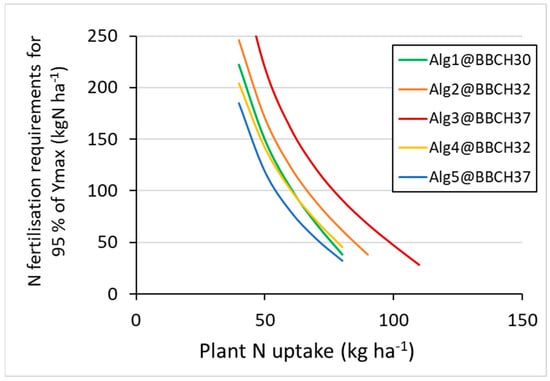 The fertiliser requirement for 95% of the maximum yield based on the various algorithms for the different BBCH stages is shown in Figure 3, which shows an exponential decrease in N fertiliser requirement with increased N uptake at any BBCH stage. For example, at BBCH30, an N uptake of 60 kg ha−1 requires a N fertilisation of 103 kg N ha−1, while at an uptake of 80 kg N/ha−1, only 38 N ha−1 needs to be applied for achieving 95% of the maximum yield. At any N uptake, the required N fertilisation rate increases with increasing phenological development. For example, at an N uptake of 60 kg ha−1, the required N fertilisation rate at BBCH30, BBCH32, and BBCH37 are 103, 123, and 161 kg ha−1. Split application, as in Algorithm 4 and Algorithm 5, reduces the required N fertilisation rate, as the future supply would be increased, as not all the applied N fertiliser would have been taken up by the crop.
