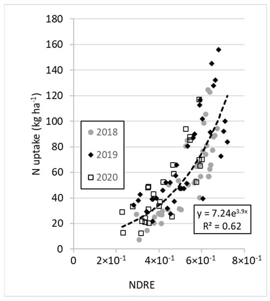 The developed algorithms can be combined with remote sensing of the N status and developed into a decision support system. A dataset, including various winter wheat trials conducted in different locations in Denmark [29] and with a range of N fertilisation, shows a good correlation between the drone-estimated NDRE (Normalised Difference Red Edge) index at growth stages 28–57 and N uptake (Figure 4), with an R2 of 0.62. As the NDRE saturates at about 0.6, this relationship should only be used up to a N uptake of about 75 kg N ha−1. Such information obtained from remote sensing can then be used to calculate the amount of fertiliser required for a targeted yield (YT) using the developed algorithm (Equation (4)), with the parameter values for the corresponding BBCH stage (Table 3). The targeted yield can be the maximum, but also the one corresponding to the economic optimum, the fertilisation rate at which the marginal cost of the fertilisation corresponds to the marginal revenue [33]. This would also comply with the maximum allowable N fertilisation rates in Denmark [34]. So, for example, an NDRE value of 0.4 equates to a N uptake of 34.5 kg ha−1 (Figure 4).