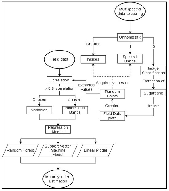 This study developed a novel method to determine the sugarcane brix and pol values and, thus, evaluate the maturity of the sugarcane. This can be applied at the operational level to estimate the sugarcane maturity and may reduce the time and cost associated with existing ground sampling-based methods. The robust results generated from this study also confirmed the data acquisition plan, including sensors for remotely sensed data acquisition, data acquisition parameters (shutter speed, flying height and overlaps, etc.) and data processing workflow for higher accuracy.