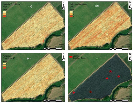Maturity index maps obtained from: (a) Multiple Linear Regression Model; (b) Support Vector Machine algorithm; (c) Random Forest model; and (d) Locations of zones 1–5 for spectral analysis (red squares). The values 0, 1 and 2 represent maturity conditions D, C and B respectively.