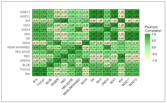 The sugarcane area was isolated with a higher degree of accuracy, and the total extent of the sugarcane was 10.23 ha. Figure 4 shows the correlation analysis results. The green band, NDWI and GDNVI were correlated the best, with brix values, providing R2 of −0.69, −0.75 and 0.68, respectively. For pol, the R2 values were −0.66, −0.73 and 0.65, respectively. Hence, green band, NDWI and GNDVI were used to predict brix and pol and, thus, the maturity index. The rest of the indices were discarded since they did not meet the threshold (±0.6) established in the method.