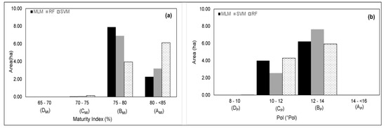 The sugarcane extent related to pol and MI: (a) areas predicted for pol using different prediction models; (b) the percentage of the area of the maturity index from different prediction models.
