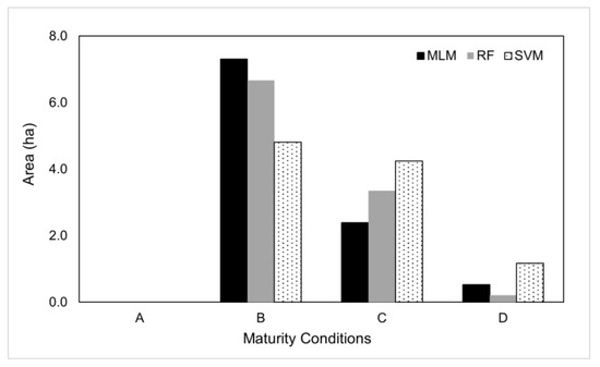 The extent of the percentage of the maturity index (Figure 5a) was grouped into four intervals: 65–70% (denoted as DMI), 70–75% (CMI), 75–80% (BMI) and >80% (AMI). For the AMI category, SVM predicted an area of 6.12 ha, RF = 3.21 ha and MLM = 2.28 ha. BMI was 3.95 ha, 6.92 ha and 7.91 ha for SVM, RF and MLM, respectively. The RF algorithm did not detect the CMI category; the rest were minimal. DMI values were zero or very small for these algorithms (Figure 5a).