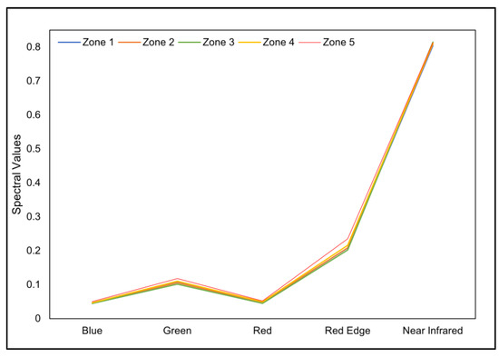 The level of maturity at the time of photography can also be checked with the spectral reflectance of sugarcane. It may represent the canopy chlorophyll and moisture levels. Hence, five distinct zones (in terms of the appearance from greener (healthy) to brownish (dry)) within the study area were selected for an area of 17 m × 17 m (Figure 3d). Within each area, random points were created using sugarcane pixels only. Then, the spectral values for each band were extracted, and spectral profiles were created.