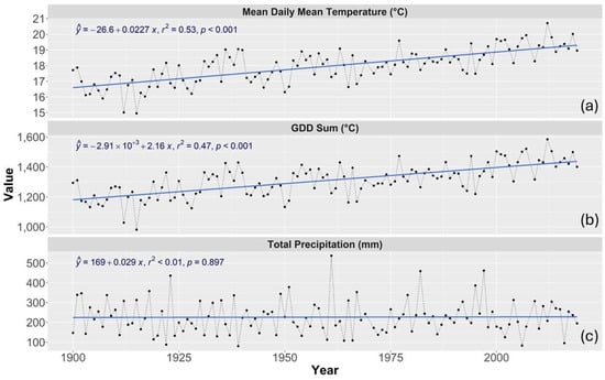 Changes in average temperature (a), growing degree days (GDD) (b), and total precipitation (c) during the corn growing season from 1900 to 2019 in Fort Collins, Colorado (Data from National Oceanic and Atmospheric Administration [NOAA] station ID #: GHCND:USC00053005). Note: Daily mean temperature (T_mean) was calculated from the daily maximum temperature (T_max) and daily minimum temperature (T_min) as follows: T_mean = (T_max + T_min)/2).