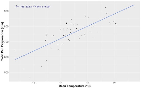 Increases in temperatures without increases in precipitation are important (Figure 1a,c) because higher temperatures will increase the evapotranspiration demand at the site and will contribute to lower yields due to higher water stress in non-irrigated systems, or even irrigated systems if the irrigation systems cannot fully meet water needs during the growing season (Figure 1a,c). We found that pan evaporation significantly increased during May to September from 1949 to 2019, going from 688 mm to 826 mm, a net increase of 138 mm with time (y = −3.21 × 103 + 2x; p < 0.001; r2 = 0.22). During this period, we found that mean air temperature was a positive predictor of pan evaporation, and an increase from 16.3 to 20.7 °C would result in a net pan evaporation increase of 356 mm (p < 0.001; r2 = 0.61) (Figure 2). We suggest that these changes in pan evaporation due to temperature increases are an indicator that there will be negative impacts on dryland corn if the higher water needs cannot be met by precipitation alone.