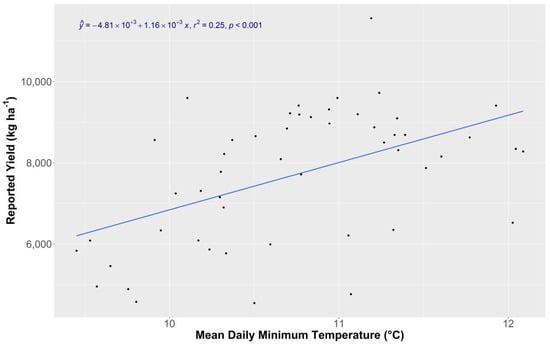 The county’s harvested corn yield from 1963 to 2019 was positively predicted by GDD (y = −1.86 × 103 + 7x; p < 0.01; r2 = 0.15). Increases in GDD during the growing season from May to September from 1160 GDD (°C) to 1580 GDD (°C) contributed to increasing harvested grain yields by 2940 kg ha−1 (oven-dried dry weight of 2484 kg ha−1). Additionally, average maximum temperatures for the growing season were predictors of county harvested corn yield for this period (y = −6.72 × 103 + 547x; p < 0.01; r2 = 0.13). Increases in maximum temperatures from 23.7 °C to 29.4 °C contributed to increasing harvested grain yields by 3118 kg ha−1 (oven-dried dry weight of 2635 kg ha−1). Average minimum temperatures for this period also were predictors of yield (Figure 3; p < 0.001; r2 = 0.25). Increases in minimum temperatures from 9.4 °C to 12.1 °C contributed to an additional 3016 kg ha−1 (oven-dried dry weight of 2549 kg ha−1).