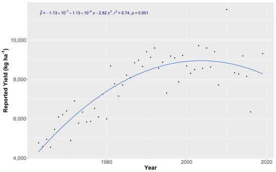 Average yields increased in the county from about 4000 kg ha−1 in 1963 to 9000 kg ha−1 in 2000 (Figure 4). Although improved varieties and management contributed to these increases in yields; higher GDD and higher maximum and minimum temperatures were also contributors, in agreement with findings from other researchers [,]. The quadratic relationship of productivity versus time in the last five plus decades shows that the yields started to plateau around the 1990s, have not increased since about 2000, and that there may be a slight trend downward since then (Figure 4; p < 0.001; r2 = 0.74).