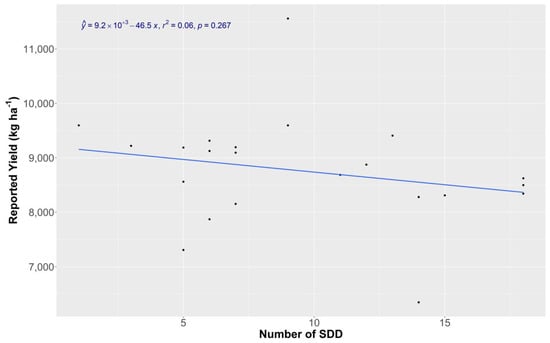 Although it was not significant at p < 0.10, we found a negative, downward trend between yields in the county in the last two decades and SDD in June (Figure 5; p = 0.267; r2 = 0.06). Since SDDs during the growing season and the month of June have been increasing since the 1900s (p < 0.001), and there is a negative trend between county yields since and SDD (Figure 5; p = 0.267) we suggest that higher SDD could potentially negatively impact corn yields at a regional level, despite the benefits of higher GDD and higher minimum temperatures in the irrigated systems.