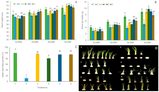 Garlic biometric parameters under controlled conditions: (A) plant height, (B) shoot dry matter, (C) secondary growth index, and (D) secondary growth in plants subjected to growth regulators. Treatments: 1 (control), 2 (deficit irrigation), 3 (ABA), 4 (trinexapac-ethyl), 5 (chlormequat chloride), and 6 (paclobutrazol) for 28 days. Minor letters indicate the comparison of the means within the same period by the LSD test (95%).