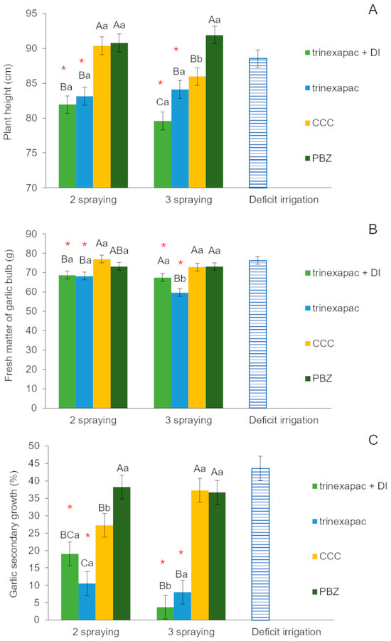 Garlic biometric parameters in the first field experiment (2020 growing season): (A) plant height (cm) at 53 DAP; (B) fresh matter of bulb (g); and (C) garlic secondary growth (%), subjected to treatments: deficit irrigation + trinexapac-ethyl (DI + TE); trinexapac-ethyl (TE); chlormequat chloride (CCC); paclobutrazol (PBZ); and additional treatment (deficit irrigation). Capital letters indicate differences among gibberellin inhibitors in the application times (two or three sprayings), and minor letters indicate differences among gibberellin inhibitors between application numbers (two or three sprayings) by the SNK test (5% significance). The symbol (*) above bars indicates differences that are significant by orthogonal contrasts (t-test), at a level of 5% significance.