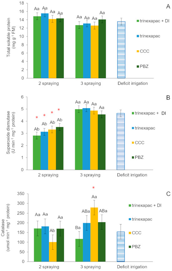 Garlic biochemical parameters in the first field experiment (2020 growing season): (A) total soluble protein (mg g−1 FM); (B) superoxide dismutase (U min−1 mg−1 protein); and (C) catalase (µmol min−1 mg−1 protein), subjected to treatments: deficit irrigation + trinexapac-ethyl (DI + TE); trinexapac-ethyl (TE); chlormequat chloride (CCC); paclobutrazol (PBZ); and additional treatment (deficit irrigation). Capital letters indicate differences among gibberellin inhibitors in the application times (two or three sprayings), and minor letters indicate differences among gibberellin inhibitors between application numbers (two or three sprayings) by the SNK test (5% significance). The symbol (*) above bars indicates differences that are significant by orthogonal contrasts (t-test), at a level of 5% significance.