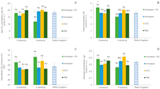 Garlic gas exchange parameters in the first field experiment (2020 growing season): (A) Net CO2 assimilation—A (μmol∙m−2∙s−1); (B) foliar transpiration—E (mmol∙m−2∙s−1); (C) intercellular CO2 concentration—Ci (Pa); (D) stomatal conductance—gs (mmol∙m−2∙s−1), subjected to treatments: deficit irrigation + trinexapac-ethyl (DI + TE); trinexapac-ethyl (TE); chlormequat chloride (CCC); paclobutrazol (PBZ); and additional treatment (deficit irrigation). Capital letters indicate differences among gibberellin inhibitors in the application times (two or three sprayings), and minor letters indicate differences among gibberellin inhibitors between application numbers (two or three sprayings) by the SNK test (5% significance). The symbol (*) above bars indicates differences that are significant by orthogonal contrasts (t-test), at a level of 5% significance.