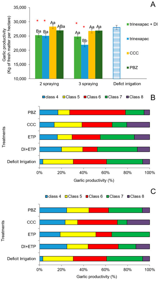 Garlic production parameters in the first field experiment (2020 growing season): (A) garlic productivity (Kg of fresh matter per hectare); (B) garlic bulb class (2 sprayings); (C) garlic bulb class (3 sprayings), subjected to treatments: deficit irrigation + trinexapac-ethyl (DI + TE); trinexapac-ethyl (TE); chlormequat chloride (CCC); paclobutrazol (PBZ); and additional treatment (deficit irrigation). Capital letters indicate differences among gibberellin inhibitors in the application times (two or three sprayings), and minor letters indicate differences among gibberellin inhibitors between application numbers (two or three sprayings) by the SNK test (5% significance). The symbol (*) above bars indicates differences that are significant by orthogonal contrasts (t-test), at a level of 5% significance.