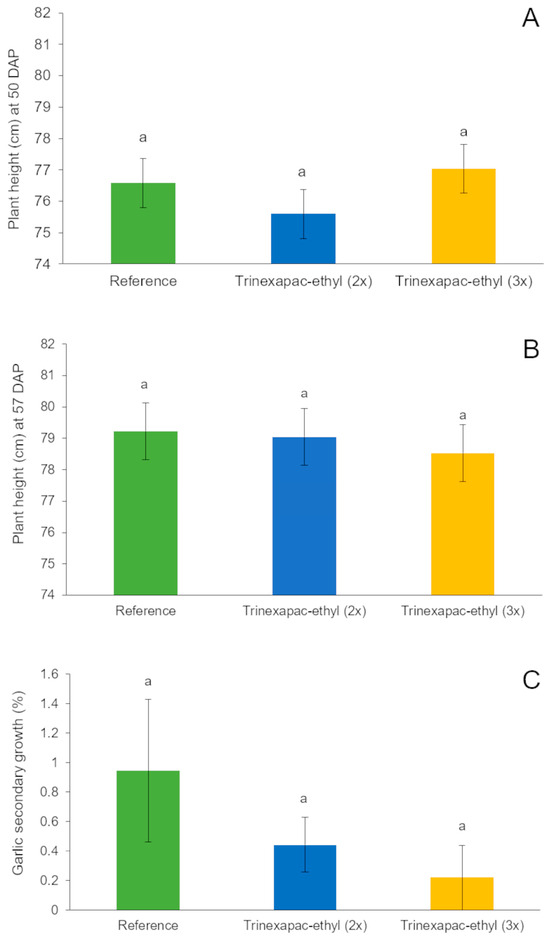 Garlic biometric parameters in the second field experiment (2023 growing season), where: (A) plant height (cm), at 50 DAP; (B) plant height (cm), at 57 DAP; and (C) garlic secondary growth (%), subjected to treatments: reference, trinexapac-ethyl (two sprayings), trinexapac-ethyl (three sprayings). Means were compared by the SNK test (5% significance). Averages followed by the same minor letter do not differ statistically by the SNK test (5% of significance).
