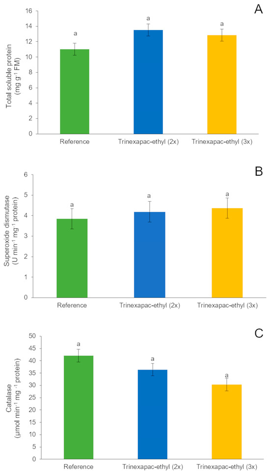 Biochemical parameters in the second field experiment (2023 growing season), where: (A) total soluble protein (mg g−1 FM); (B) superoxide dismutase (U min−1 mg−1 protein); and (C) catalase (µmol min−1 mg−1 protein), subjected to treatments: reference, trinexapac-ethyl (two sprayings), trinexapac-ethyl (three sprayings). Means were compared by the SNK test (5% significance). Averages followed by the same minor letter do not differ statistically by the SNK test (5% of significance).