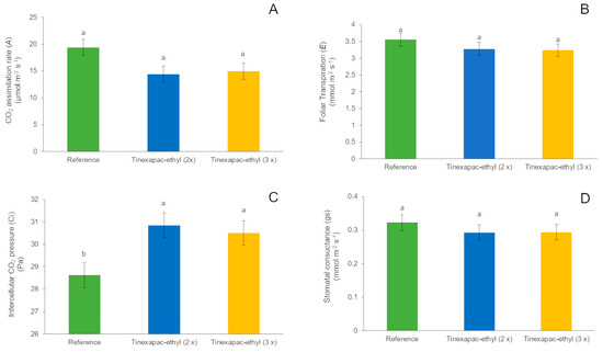 Gas exchange parameters in the second field experiment (2023 growing season), where: (A) Net CO2 assimilation—A (μmol∙m−2∙s−1); (B) foliar transpiration—E (mmol∙m−2∙s−1); (C) intercellular CO2 concentration—Ci (Pa); and (D) stomatal conductance—gs (mmol∙m−2∙s−1), subjected to treatments: reference, trinexapac-ethyl (two sprayings), trinexapac-ethyl (three sprayings). Means were compared by the SNK test (5% significance). Averages followed by the same minor letter do not differ statistically by the SNK test (5% of significance).
