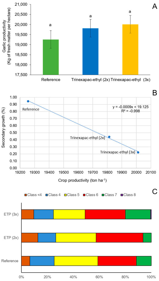 Garlic production parameters in the second field experiment (2023 growing season): (A) bulb production per area (unit per m−2); (B) garlic productivity (kg of fresh matter per hectare); (C) garlic bulb class, subjected to treatments: reference, trinexapac-ethyl (2 spraying), trinexapac-ethyl (three sprayings). Means were compared by the SNK test (5% significance). Averages followed by the same minor letter do not differ statistically by the SNK test (5% of significance).