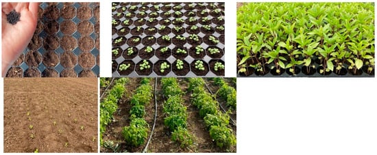 The seedlings were cultivated at the Laboratory of Agriculture and Applied Crop Physiology at the University of Thessaly. On 22 March 2023, seeds were sown in trays de-signed to accommodate 144 seedlings (arranged in a 9 × 16 configuration). After approximately two months, the seedlings were deemed ready for transplantation, which occurred manually on May 16 (Figure 1).