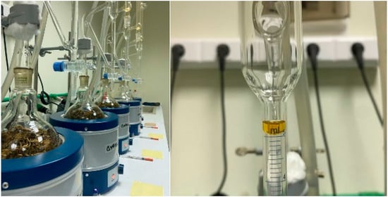 Essential oil yield was calculated by multiplying the essential oil concentration by the dry biomass yield of basil per hectare, while the evaluation of essential oil content was performed utilizing a Clevenger-type distillation apparatus (Figure 2).