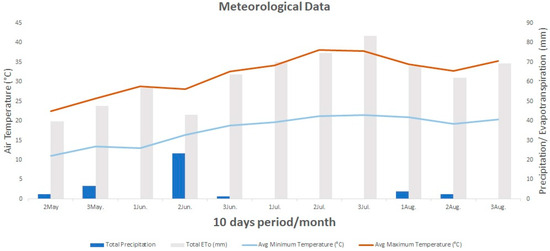 Mean minimum and maximum air temperature (°C), total precipitation and total ETo (mm) from May (basil transplanting) to (second basil sampling) August 2023 (10-day intervals).