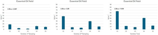 All tested varieties showed statistically significant variations in total essential oil yield. The V1 variety (Lemon) produced the highest yield, nearing 65 kg ha−1, while the V3 variety (Salat) had the lowest yield, amounting to just 8 kg ha−1 (Figure 4).